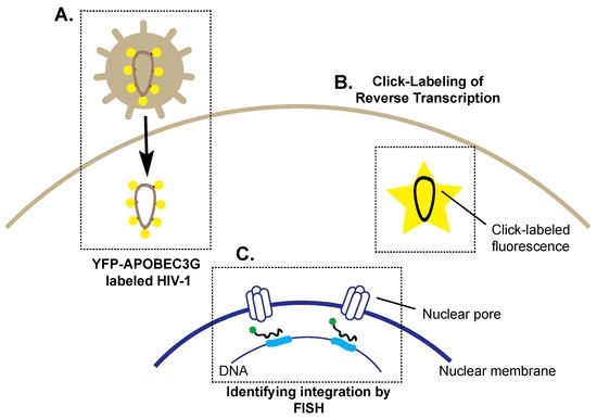 Following viral entry, a hallmark of the retroviral lifecycle is the ability to reverse transcribe the RNA genome into DNA, thereby enabling stable integration into the host’s genome [49,50]. As such, HIV-1’s ability to initiate reverse transcription and integrate into the host genome is critical for establishing chronic infection [51]. Recently, mechanisms of HIV-1 virion trafficking to the nucleus and integration have been unraveled using reporter viruses and RNA probes.