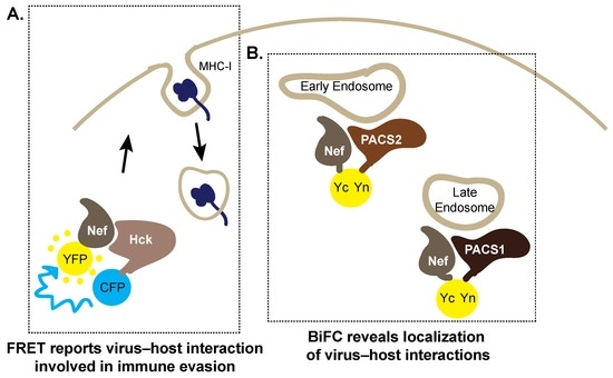 Fluorescence-based methods to monitor virus–host interactions required for the HIV-1 accessory protein negative factor (Nef) to hijack the host cell. (A) Key interactions between Nef and the Src-family kinase Hck are detectable in cells by Forster resonance energy transfer (FRET). Co-expression of Hck–CFP (cyan fluorescent protein) and Nef–YFP (yellow fluorescent protein) generates a FRET signal demonstrating their interaction. This interaction activates the signaling pathways required to internalize major histocompatability complex-I (MHC-I) from the cell surface to prevent cytotoxic killing of HIV-1 infected cells; (B) Bimolecular fluorescence complementation (BiFC) reports the interaction between the PACS1 and PACS2 proteins and Nef, localizing these interactions to early and late endosomal compartments, respectively. Yn: N-terminal of YFP, Yc: C-terminal of YFP, which reconstitute upon protein–protein interactions.