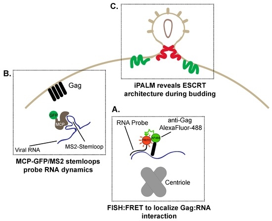 Early experiments exploring RNA–Gag interactions relied on FRET using a combination of immunofluorescence and in situ hybridization of RNA [94]. A combination of tetramethylrhodamine (TRITC)-immunostained Gag and AlexaFluor-488-conjugated antisense-RNA directed at HIV-1 viral RNA demonstrated the interaction between viral RNA and Gag by FRET (Figure 5A) [94]. Critically, this interaction was centered around the centriolar region [94]. Furthermore, the precise localization of viral RNA and the RNA–Gag interaction was dependent on the psi sequence, a specific region in the viral RNA necessary for the in vitro interaction [94]. Dynamics of the Gag–viral RNA interaction were established under live cell imaging [95]. To track viral RNA, the incorporation of the Escherichia coli anti-termination beta-glucoside utilization gene product (BglG) protein in an YFP-tagged form into the Pol region of the HIV-1 genome detected single RNA viral genomes. This technique is based on the high affinity interaction of BglG protein and RNA which contains a specific recognition sequence [96]. Analysis of YFP-BglG-tagged genomes revealed that disruption of the cytoskeleton did not alter the random walk nature of the RNA [95]. From this, it was established that the random nature of RNA trafficking within the cell, independent of host factors, may represent a mechanism where HIV-1 ensures delivery of viral RNA for assembly with minimal evolutionary push back from the host to ensure the successful completion of the viral lifecycle.