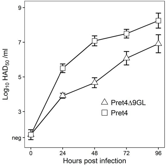 In vitro growth characteristics of Pret4Δ9GL (triangles) and parental Pret4 (squares) viruses. Primary swine macrophage cell cultures were infected (multiplicity of infection (MOI) 0.01) with either Pret4Δ9GL or Pret4 and virus yield titrated at different times post infection. Data represent mean and standard deviation (SD) from three independent experiments. Limit of detection: 1.5 hemadsorption (HAD)50/mL. Neg: negative.