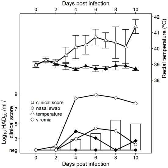 Comparative virulence studies between of Pret4Δ9GL (black symbols) and Pret4 (white symbols and bars). Whole blood and nasal swabs were titrated on primary swine macrophage cell cultures. Limit of detection: 1.5 HAD50/mL.