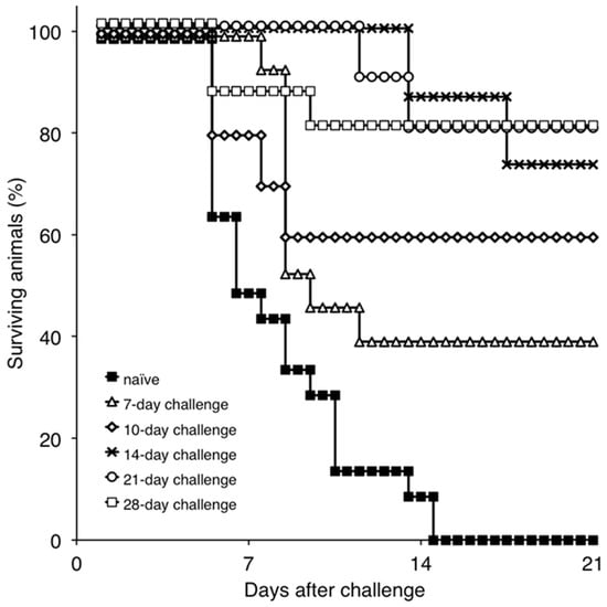 Percentage of surviving animals challenged with Pret4 virus at different times post intramuscular (IM) inoculation with Pret4Δ9GL. Swine were infected with 104 HAD50/mL Pret4Δ9GL virus and challenged with virulent Pret4 (same dose and route) at either 7 (n = 15), 10 (n = 10), 14 (n = 15), 21 (n = 10), or 28 (n = 15) days later.