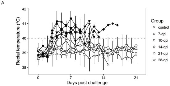 Rectal temperature (A) and viremia (B) in Pret4Δ9GL virus-infected animals challenged with Pret4 virus at different times. Average and SD of each group along a 21-day observational period is presented. Viremia values are expressed as log10 HAD50/mL. Limit of detection: 1.5 HAD50/mL. Survival status of swine is indicated as survived (white open shapes) or did not survive (black filled shapes). Dpi: days post infection.