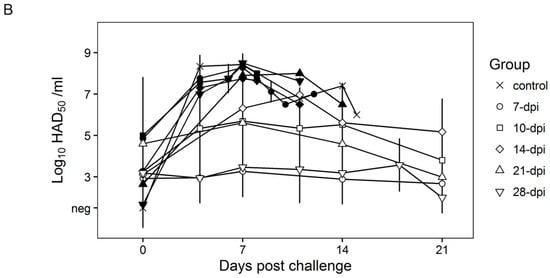 Surviving swine, regardless of the time of the challenge, all present a relatively good health showing only very transient raises of body temperature (1–6 days) without any severe clinical signs associated with the disease (Figure 4A). Most swine succumbing to the challenge present similar kinetic patterns of clinical signs which closely resemble those of the challenged naïve animals, starting by day 3–5 post challenge (pc) and humanely ending by day 8–10 pc (Figure 3 and Figure 4A). A few swine in the 14, 21, and 28-day challenge groups had a delayed onset of clinical disease and were humanely euthanized at 11–18 days post challenge. Consistent with the presentation of clinical signs associated with the disease, the kinetics of viremia in all succumbing animals practically overlaps those of challenged naïve animals peaking around day 7 pc and remaining high until animals were euthanized (Figure 4B). Viremia in animals surviving the challenge is present with a broad range of titers (103 to 108 log10 HAD50/mL peaking at day 7–10 pc) in all groups at almost all the time points tested during the observational period of 21 days pc (Figure 4B).