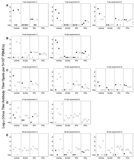 Viremia and immunological parameters at the time of challenge, day zero, in animals infected with Pret4Δ9GL. Values of viremia, anti-African swine fever virus (ASFV) antibody titers detected by ELISA and immunoperoxidase (IPA), and the number of circulating ASFV-specific interferon (IFN)-γ-producing cells are presented for each individual pig. Survival status of swine is indicated as survived (white open shapes) or did not survive (black filled shapes). Pret4Δ9GL virus infected-animals were challenged at 7 (A), 10 (B), 14 (C), 21 (D), or 28 (E) days later. PBMCs: peripheral blood mononuclear cells.