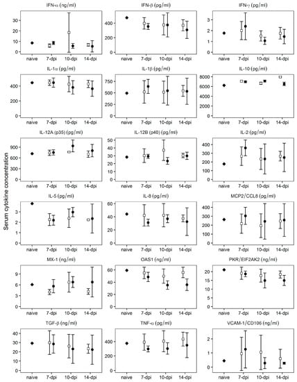Levels of serum monocytes chemoattractant protein 2 (MCP2), transforming growth factor beta 1 (TGF-β1), IFN-α, IFN-β, IFN-γ, interleukin 1-α (IL1-α), IL1-β, IL-2, IL-5, IL-8, IL-10, IL-12 p35, IL-12 p40, 2′-5′-oligoadenylate synthetase 1 (OAS), protein kinase R (PKR), tumor necrosis factor (TNF), MX-1, and vascular cell adhesion molecule 1 (VCAM-1) were assessed using commercial ELISAs following manufacturer protocols (MyBioSource, San Diego, CA, USA). Detection of serum cytokines was performed at the time of challenge.