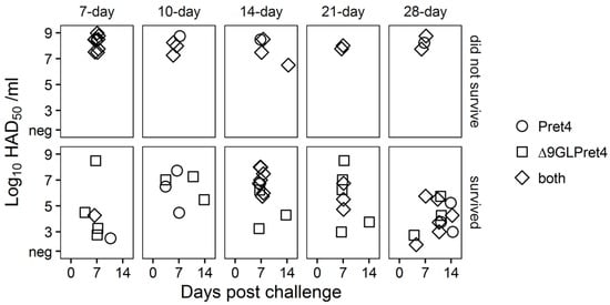 It is possible that infection with Pret4Δ9GL as a competitive factor may play a role in the process of protection against the challenge with virulent Pret4 virus. Therefore, the correlation between the presence of Pret4Δ9GL viremia at the time of challenge in protected swine was analyzed in all of the groups. Pret4Δ9GL viremia titers at the time of challenge are quite heterogeneous (ranging from undetectable to around 7 log10 HAD50/mL) in all of the groups considered (animals challenged at 7, 10, 14, 21 and 28 days post Pret4Δ9GL virus infection). This heterogeneity in viremia is found in all swine independent of their survival status after challenge (Figure 5A–E). Of particular importance is that in each of the groups, on average, animals surviving the challenge have viremia titers ranging from as low as negative (≤1.5 log10 HAD50/mL) to values as high as 4–7 log10 HAD50/mL. Therefore, no clear correlation could be established between the presence of Pret4Δ9GL viremia at the time of challenge and protection against virulent challenge.