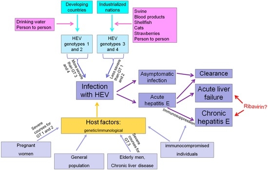 Besides individual host factors, the natural history of HEV infection depends on the viral genotype (Figure 1). In addition, in three groups of patients, the disease course and prognosis are different: immunosuppressed patients are at risk to develop chronic hepatitis, while HEV infection in patients with underlying chronic liver disease and in pregnant women (with HEVGT 1 infection) is associated with a poor prognosis. Thus, the impact of these factors will be discussed in more detail.