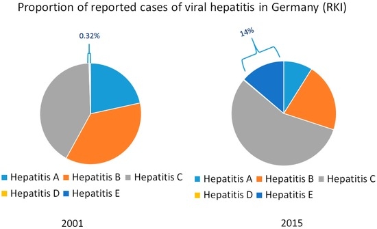 Proportion of diagnosed cases of hepatitis A–E in Germany basing on data from the Robert-Koch-Institute (RKI).