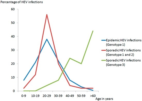 Besides the mode of transmission, HEV-genotypes display several different clinical features. It has been shown that tropical epidemic cases and tropical sporadic cases of hepatitis E (HEV GT 1 and 2) more frequently affect younger people than sporadic HEV GT 3 infections in high-income countries, which affect primarily middle-aged/elderly male (Figure 3) [60].