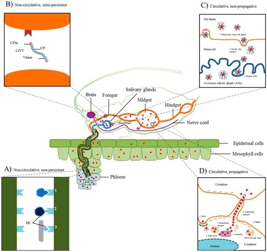 - Gray, S.; Cilia, M.; Ghanim, M. Circulative, “nonpropagative” virus transmission: An orchestra of virus-, insect-, and plant-derived instruments. Adv. Virus Res. 2014, 89, 141–199. [Google Scholar] [PubMed]
