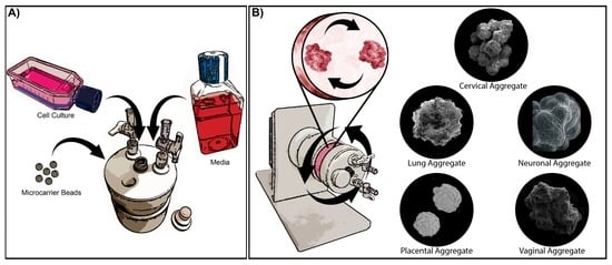 In the RWV bioreactor, cells are cultured with microcarrier beads or matrices that allow the cells to attach and spontaneously develop 3D ultrastructures representative of the parental tissue. As the cells grow and develop, cellular aggregates form via bead-to-bead bridges, and cellular aggregates can be sampled at various time points to monitor the progress of development []. The low fluid-shear environment prevents the cells from detaching from the microcarriers and protects growing tissue aggregates from damage that can occur from excess agitation during culturing []. The low fluid-shear environment also promotes the co-localization of particles in the fluid and leads to the formation of the bead-to-bead bridges and cellular aggregates []. In addition, this low fluid-shear environment mimics the flow in vivo during development and thereby promotes cellular differentiation as cells signal and grow in 3D. Developing 3D aggregates are kept in a continuous free-fall state of neutral buoyancy that precludes aggregate sedimentation, while maintaining the low fluid-shear environment, and allows the cells to grow around the microcarrier and develop complex structures observed in vivo (Figure 1) [,,,,]. In the RWV bioreactor, oxygenation occurs by the diffusion of dissolved gasses, creating a zero headspace environment that provides the necessary oxygenation for the developing aggregates while maintaining the low fluid-shear environment []. Collectively, these growth conditions allow for 3D tissue aggregates to develop and form organotypic ultrastructures that are not readily present in conventional monolayer cell culture and are necessary for advancing the development of in vitro models that effectively recapitulate in vivo tissue. For example, epithelial cells grown in the bioreactor express adhesion proteins, form desmosomes and tight junctions, produce secretory material and mucus and also form microvilli and microridges [,,,,,,]. Notably, cells that are seeded into the bioreactor reflect their phenotype. For example, vaginal epithelial cells form a multi-layered stratified squamous epithelium, whereas endocervical epithelial cells form a single layer as found in vivo, therefore reflecting the authentic microanatomical features of the parental tissue [,]. Cancerous cell lines, on the other hand (e.g., MCF-7 cells), no longer require the extracellular matrix for growth, do not attach and grow on the collagen-coated microcarrier beads, thereby reflecting their cancer phenotype. Fully-differentiated aggregates can remain in the bioreactor for infection or aggregates can be harvested and plated for downstream experiments, including infections.