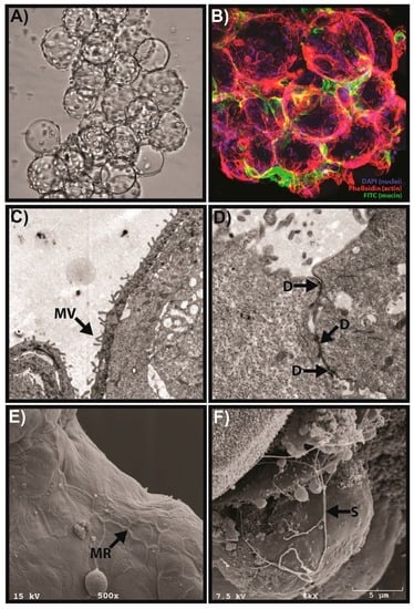 Example of physiological features of the RWV bioreactor-derived human 3D vaginal aggregates. (A) Phase micrograph of 3D vaginal epithelial cell aggregates consisting of multiple microcarrier beads connected by cell-cell junctions at an early stage of development. (B) Immunofluorescence of 3D aggregates by laser scanning confocal microscopy demonstrating localized mucus secretion modified from Hjelm et al. [] with permission. Nuclei are stained with DAPI (blue); actin filaments are stained with phalloidin (red); and mucin 1 (MUC1) is stained with FITC (green). (C) Transmission electron microscope (TEM) image of 3D vaginal aggregates showing microvilli (MV), modified from Hjelm et al. [] with permission. (D) TEM micrograph depicting desmosomes (D) at cell-cell junctions between vaginal epithelial cells. (E) SEM image showing formation of microridges (MR) at cell-cell junctions during late-stage development of 3D aggregates. (F) Production of secretory material (S) by vaginal 3D aggregates as shown by SEM.