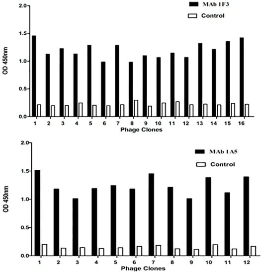 After the three rounds of biopanning described above and elsewhere [,], individual phage clones were selected for target binding in the enzyme-linked immunosorbent assay (ELISA). Briefly, 96-well plates were coated with 100 ng of the mAbs (1F3 and 1A5) or an anti-porcine interferon (IFN)-c mAb (Sigma, St. Louis, MO, USA) as a negative control. After the coated wells were blocked, the phages (1010 pfu/100 μL/well) were added. The coated plates were washed ten times with phosphate buffered saline (PBS) + 0.5% (v/v) Tween-20 (PBST), and the bound phages were reacted with an horseradish peroxidase (HRP)-conjugated sheep anti-M13 antibody (Pharmacia, Piscataway, NY, USA) as previously described [,]. Colored precipitation was achieved by adding substrate solution containing o-phenylenediamine (OPD). The positive phage clones were sequenced using a previously reported sequencing primer [,].