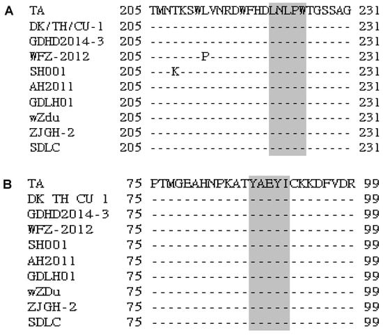 Sequence alignment of the epitope-coding regions LNLPW (A) and YAEYI (B) in the DTMUV strain E proteins. The amino acid positions for each sequence are numbered on both sides. The DTMUV TA strain sequence is shown at the top; the dashes indicate identical amino acids. The identified epitope region is boxed in grey.