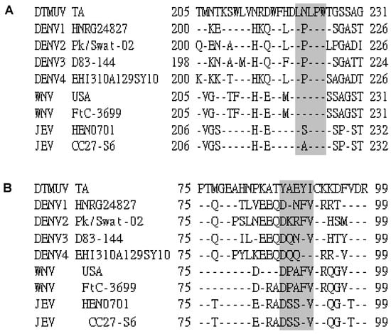 Sequence alignment of the epitope-coding regions LNLPW (A) and YAEYI (B) in the flavivirus strain E proteins. The amino acid positions for each sequence are numbered on both sides. The DTMUV TA strain sequence is shown at the top; the dashes indicate identical amino acids. The identified epitope region is boxed in grey.