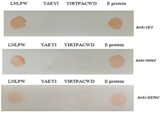 To demonstrate the epitope cross-reactivity with other flaviviruses, purified YAEYI and LNLPW fragments were used to test their cross-reactivity with WNV-, JEV-, and DENV-positive sera in the dot blotting assay. The WNV-, JEV-, and DENV-positive sera reacted with the LNLPW peptide and E protein but did not react with YAEYI and the negative control peptide (Figure 6).