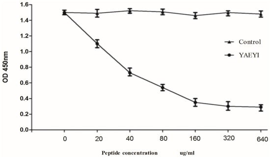 The peptides were synthesized in the MAP form because the binding efficiency of an eight-chain MAP is greater than the binding efficiency of a single-chain peptide []. Competitive binding assays were performed to confirm that the E protein peptide YAEYI was an E protein epitope. These assays showed that the reactivity of mAb 1A5 with the E protein was markedly inhibited by the synthetic antigen peptide YAEYI in a dose-dependent manner (p < 0.05; Figure 8) after Student’s t-test statistical method analysis.