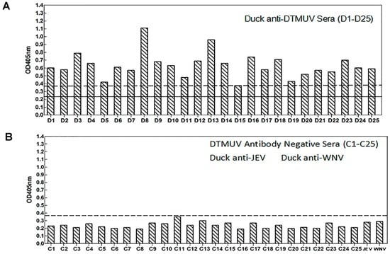 ELISA plates were coated with 50 µL/well of 640 µg/mL of synthetic peptide antigen and incubated at 4 °C overnight. After washing with PBST, the plates were blocked with PBST containing 5% (w/v) skimmed milk for 1 h at 37 °C. The diluted duck DTMUV-positive/negative sera and the WNV- and JEV-positive sera diluted in blocking solution were added and incubated for 1 h at 37 °C. After washing, 100 µL/well of the diluted goat anti-duck IgG conjugate (1:400 dilution) in blocking solution was added and incubated for 1 h at 37 °C. The plates were washed three times and then incubated with 50 µL of p-nitrophenyl phosphate (PNPP) substrate (Shanghai Biomedicine, Shanghai, China) for 20 min. The reactions were stopped by adding 3 M NaOH, and the plate was read on a microplate reader (Bio-Rad, Beijing, China) at 405 nm. An aliquot (100 µL/well) of the 1:400 diluted conjugate was added after washing.