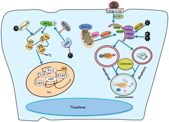 Apart from bulk autophagy, the Edmonston-MeV strain also exploits the selective mitophagy in non-small cell lung cancer (NSCLC) cells, which enhances its replication as well []. The mitophagy occurs upon Edmonston-MeV infection via recognition of damaged mitochondria by the autophagic receptor SQSTM1/p62, the devouring of these mitochondria by autophagosomes, and the subsequent degradation by lysosomes []. By clearing damaged mitochondria before they release cytochrome c, mitophagy prevents the beclin 1-mediated activation of Bid or the degradation of active caspase-8 and then inhibits apoptosis, resulting in migitated cell death and the consequent oncolysis in NSCLC induced by Edmonston-MeV []. More important than the inhibition of apoptosis, though, is the attenuation of the RIG-I/MDA5-mediated signaling pathway via the SQSTM1/p62-mediated degradation of mitochondrion-tethered mitochondrial antiviral signaling protein (MAVS), suggesting a novel mechanism of Edmonston-MeV to weaken the innate immune responses []. An overview of host factors involved in MeV inducible stress granule formation and autophagy is depicted in Figure 3.