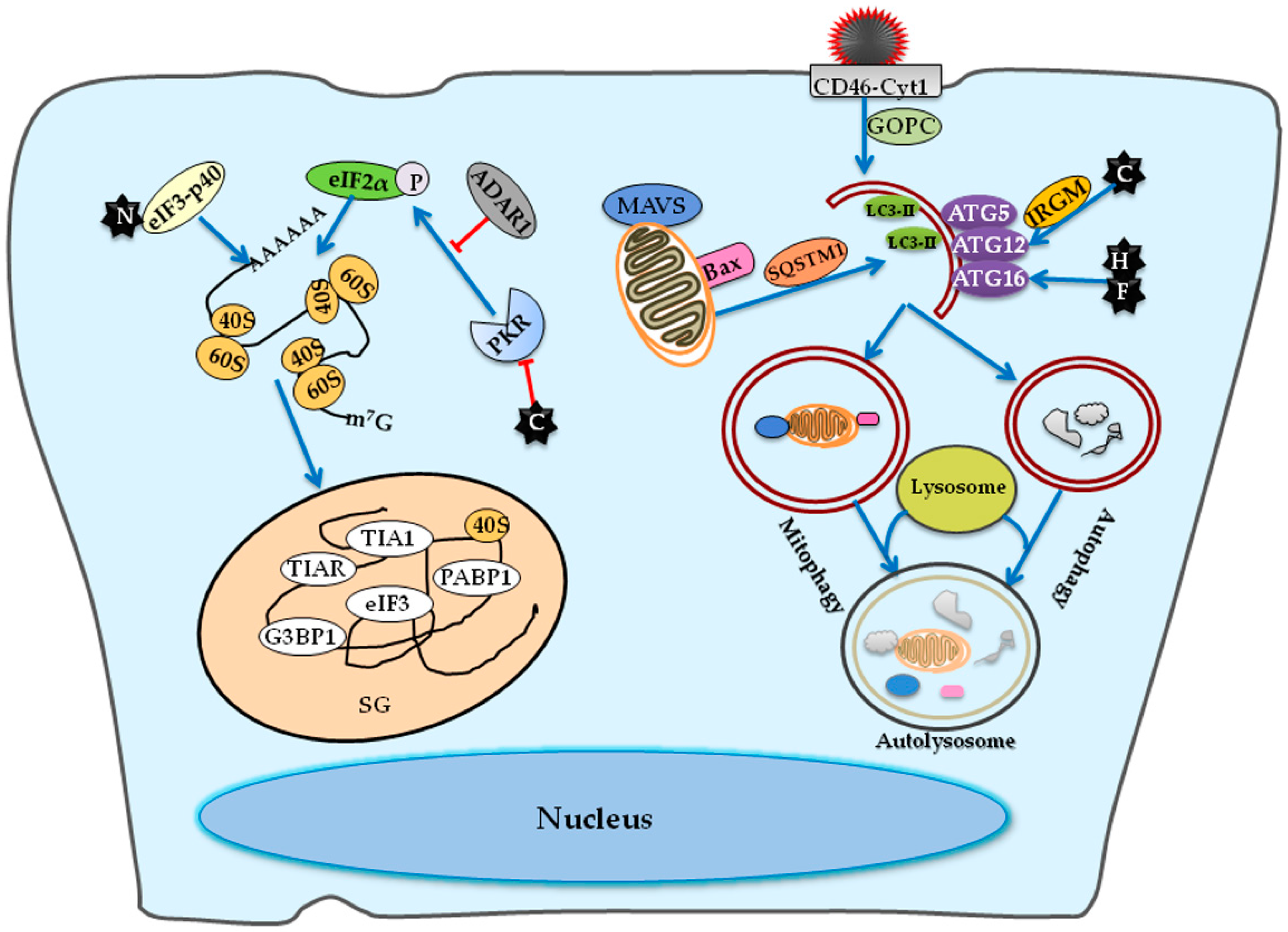 A diagram of host factors involved in MeV inducible stress granule formation and autophagy. The C protein suppresses the activation of PKR, so a mutant MeV lacking C protein expression rather than the wild-type MeV induces the stress granule (SG) formation. The N protein binds to the eIF3-p40 and then promotes SG formation. As a suppresser of PKR, ADAR1 suppresses the PKR-dependent SG formation. The infection of Edmonston-MeV strain initiates an early but transient autophagy wave via the engagement of CD46-Cyt-1 in a Golgi-associated PDZ and coiled-coil motif-containing protein (GOPC)-dependent pathway. Moreover, the expression of C protein can induce an autophagic signaling in an immunity-related GTPase M (IRGM)-dependent manner. The expression of H and F proteins in cells expressing one of the cellular receptors is also sufficient to induce autophagy. The Edmonston-MeV strain also exploits the selective mitophagy via recognition of damaged mitochondria by autophagic receptor SQSTM1, resulting in the degradation of mitochondrion-tethered mitochondrial antiviral-signaling protein (MAVS) and subsequent attenuation of RIG-I/MDA5-mediated responses. The arrows indicate the activation of innate immune responses while the T-ended arrows indicate the repression by MeV.