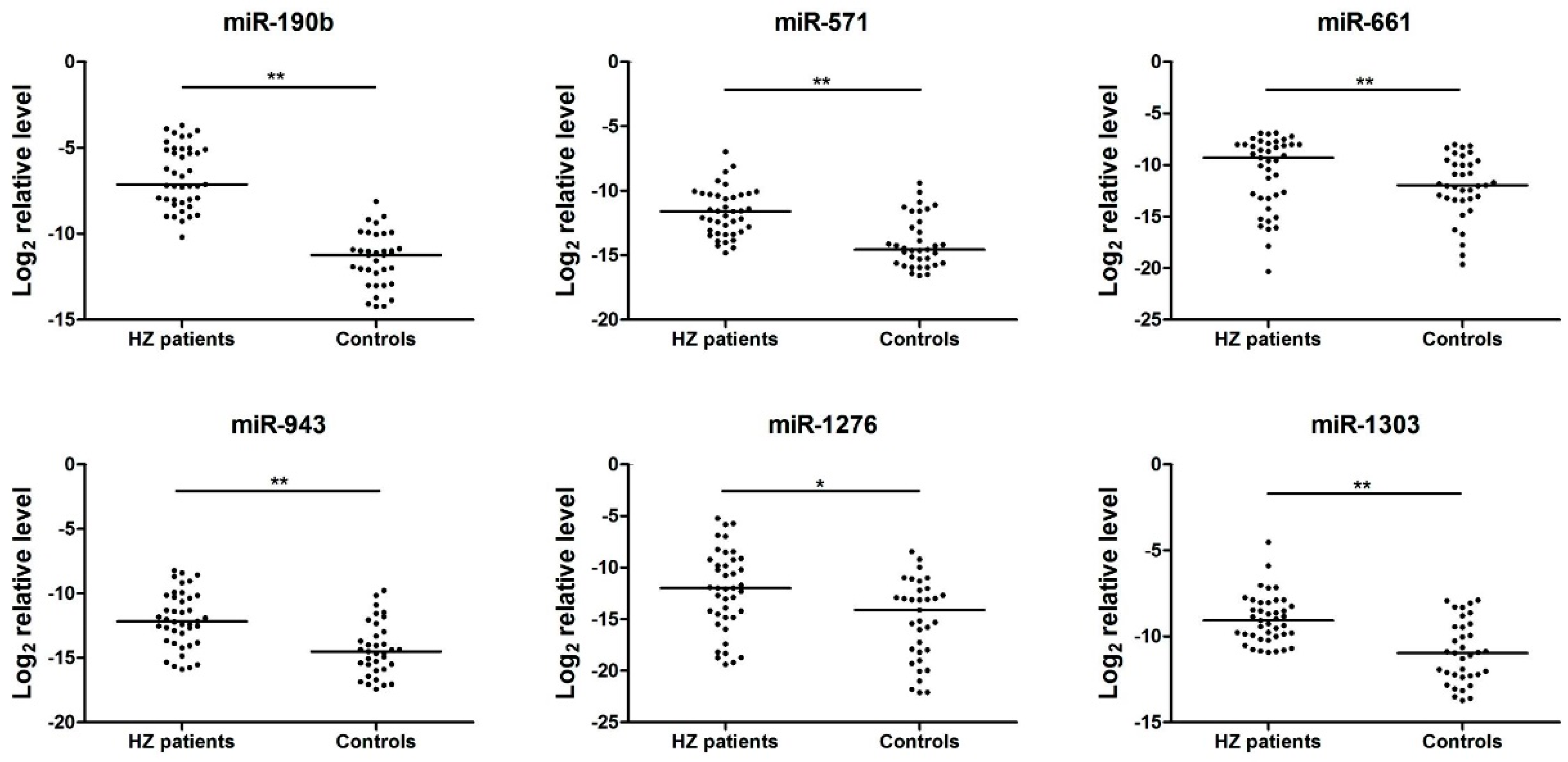 Fifteen serum microRNA (miRNA) levels in herpes zoster (HZ) patients and healthy controls were selected for verification using real-time quantitative reverse transcription PCR (qRT-PCR) in individual HZ patients (n = 41) and healthy controls (n = 35). Serum levels of miR-190b, miR-571, miR-1276, miR-1303, miR-943, and miR-661 were significantly higher in HZ patients compared with those in the control group (* p < 0.05, ** p < 0.01), while no significant differences were detected in the expression of miR-1243, miR-1238, miR-520d-3p, miR-541, miR-1225-3p, miR-605, miR-1, miR-627, and miR-1233 (p > 0.05). Expression levels of the serum miRNA levels were normalized to cel-miR-39 (spiked-in synthetic miRNA as an internal control).