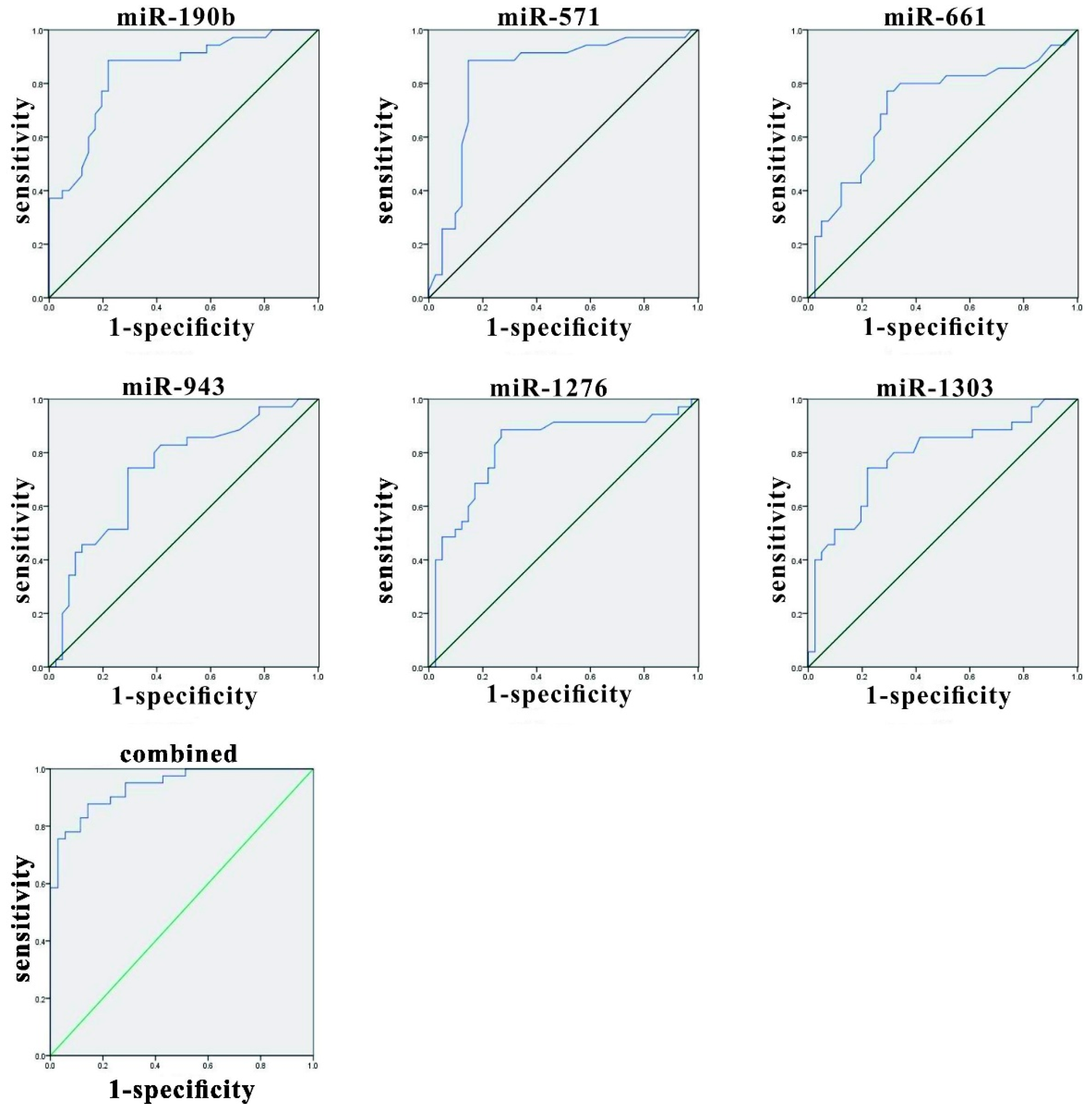 Receiver operating characteristic (ROC) curves of differentially expressed miRNAs between HZ patients and healthy controls. ROC curves of miR-190b, miR-571, miR-1276, miR-1303, miR-943, and miR-661 showed a moderate distinguishing efficiency. The combination of the six miRNAs showed a slightly higher area under the ROC curve (AUC) value of 0.939.