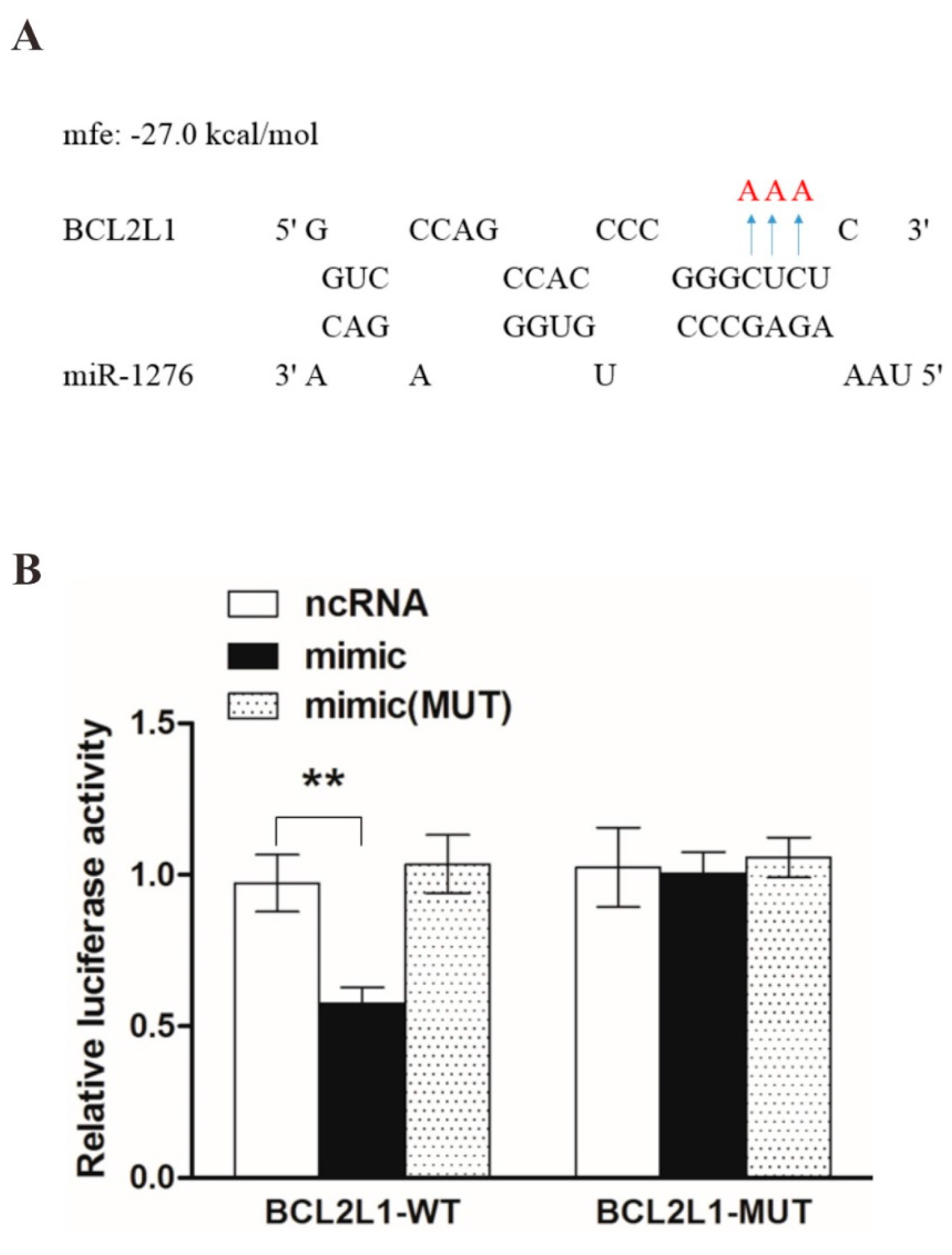 MiR-1276 targeting the 3′UTR of BCL2L1 mRNA. (A) The predicted binding site for miR-1276 in BCL2L1 3′UTR. In 3′UTR mutant, replaced nucleotide (red) was indicated by the arrows; and (B) luciferase activity in HEK293T cells transfected with plasmid encoding wild-type (WT) or mutated (MUT) 3′UTR of human BCL2L1 plus control RNA, mimic miR-1276, or mimic miR-1276 (M); (** p < 0.01).