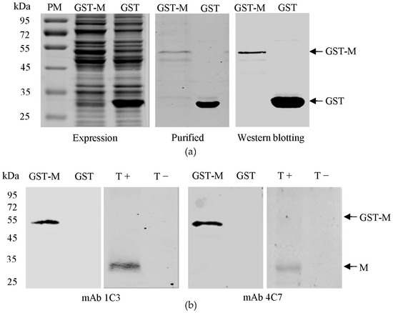 For prokaryotic expression of the M protein, the signal peptide (aa 1–16) was removed, and the M gene was cloned into the prokaryotic expression vector pCold GST DNA. The recombinant proteins were expressed by induction with 1 mM IPTG in pCold-TGEV-M-transformed cells. The size of the recombinant GST-M protein was approximately 54 kDa. The purified GST-M protein reacted with the anti-GST mAb in the western blotting experiment (Figure 1a).