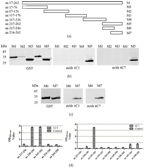 To identify the 1C3 and 4C7 mAb epitopes, five truncated M proteins (GST-M1, GST-M2, GST-M3, GST-M4 and GST-M5) were expressed (Figure 2a). Figure 2b shows that 1C3 and 4C7 were reactive with GST-M5. Subsequently, two truncated M proteins that covered aa 217–262 were expressed. The western blotting results demonstrated that both 1C3 and 4C7 reacted against GST-M7 aa 234–262 (Figure 2c).