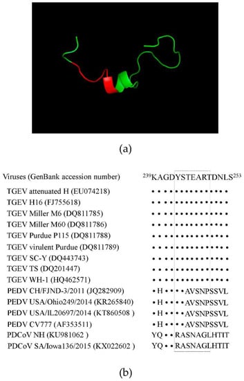 The TGEV M protein sequence was compared against the SWISS-MODEL template library. The solution structure of ADP-ribosyl cyclase (SMTL id 1r15.1) [39] was selected for model building. The identified epitope recognized by mAb 1C3 (YSTEART) formed an alpha spiral structure (Figure 3a). Furthermore, the conservation of the M epitopes (YSTEART) in TGEV, PEDV, and porcine deltacoronavirus (PDCoV) was compared. As shown in the sequence alignment in Figure 3b, the epitope (YSTEART) is well conserved among TGEV, but differs greatly from the sequence in PEDV and PDCoV.
