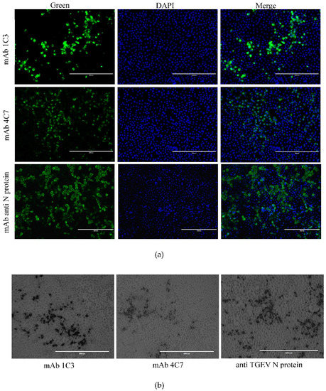 Application of the generated mAbs 1C3 and 4C7 in immunofluorescence assay (IFA) and immunoperoxidase monolayer assay (IPMA). (a) IFA analysis of the M protein in TGEV-infected PK-15 cells using 1C3 and 4C7 mAbs; (b) IPMA assay of the M protein in TGEV-infected PK-15 cells using 1C3 and 4C7 mAbs. The mAb against the N protein of TGEV was used as a positive control.