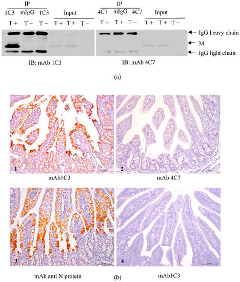 Application of the generated mAbs 1C3 and 4C7 in IP and immunohistochemistry (IHC). (a) Immunoprecipitation analysis of the M protein in TGEV-infected PK-15 cells using 1C3 and 4C7 mAbs. T+ represents the cell lysates of TGEV-infected PK-15 cells. T− represents the cell lysates of mock-infected PK-15 cells. The mIgG represents mouse control IgG; (b) IHC analysis of the M protein in the small intestines of TGEV-inoculated animals using 1C3 (1) and 4C7 (2) mAbs and an N-protein mAb (3) as a positive control. Staining of the small intestines of mock-inoculated animals with 1C3 mAb is shown as a negative control (4).