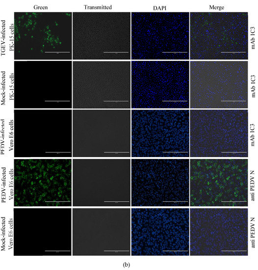 The IgG of mAb 1C3 was purified using HiTrapTM protein G HP (Figure 6a). The IFA method was optimized for the detection of the TGEV M protein. At 36 h, TGEV-infected PK-15 cells (103 TCID50) were fixed with paraformaldehyde (4%) for 30 min at 4 °C. Then, the cells were blocked with 5% skimmed milk at 37 °C for 1 h. The optimum concentration of the primary antibody (purified 1C3 IgG) was 1 ng/µL, and the dilution of the secondary antibody was 1:500. The IFA detected green fluorescence in the TGEV-infected PK-15 cells (Figure 6b). To further validate whether 1C3 react with PEDV, IFA was used. As shown in Figure 6b, 1C3 did not react with the PEDV.