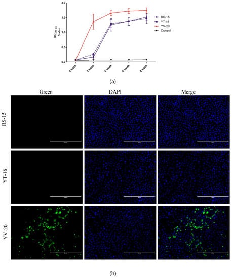 To examine the ability of the two epitopes identified in this study to induce antibody responses, arginine-glycine-aspartate [40] was added on the N-terminal side of peptide aa 243–249 (RS-15), and an overlay of peptide aa 243–249 (YT-16) and peptide aa 243–262 (YV-20) were used to immunize mice. The epitopes were coupled with KLH and named RS-15-KLH, YT-16-KLH, and YV-20-KLH, respectively. BALB/c mice were immunized once every two weeks using RS-15-KLH, YT-16-KLH, or YV-20-KLH. Sera were collected at 0, 2, 4, 6 and 8 weeks. The antibodies elicited by RS-15-KLH, YT-16-KLH, and YV-20-KLH were detected using an indirect peptide ELISA with RS-15-BSA, YT-16-BSA, and YV-20-BSA as the antigen, respectively. At 4 weeks, the sera collected from the three immunized groups showed a detectable antibody response. In contrast, the control group inoculated with PBS did not show any significant immunity (Figure 7a). The antibody level increased with the number of immunizations. At 8 weeks, the antibody levels of all three immunized groups reached the highest values. Next, we examined whether the antibody was able to react with the native M protein in TGEV-infected PK-15 cells. Figure 7b shows that only the antibody elicited by the YV-20-KLH epitope reacted with the M protein, whereas no reaction was detected for RS-15-KLH or YT-16-KLH.