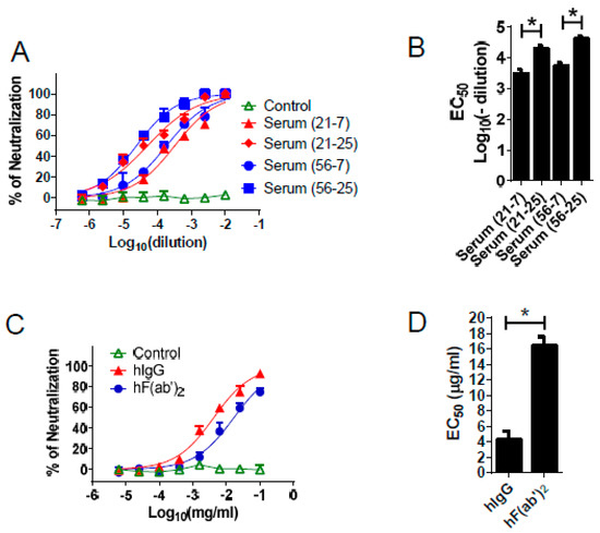 Neutralization assay for WNV using immune horse serum, purified IgG, and F(ab′)2 in vitro. The “21” and “56” are the horse ID numbers. The “21–7”, “56–7” and the “21–25”, “56–25” represent the sera that were collected after the fourth or fifth immunization, respectively. (A,B) Serum or (C,D) antibody samples from “56–25” were serially diluted in Dulbecco’s modified Eagle medium (DMEM) and mixed 1:1 with 80 PFU (Plaque Forming Unit) WNV. After a 1-h incubation at 37 °C, the mixture was added to Vero cells for an additional 1 h. After absorption, the cells were then overlaid with 1.2% agarose. After a further incubation for 3 days, the agarose plugs were removed. The plaques were visualized by 0.1% crystal violet staining; (B) The dilutions; and (D) Concentrations for 50% of the maximal neutralizing effect are shown. * p < 0.05. Normal horse IgG was used as the control.