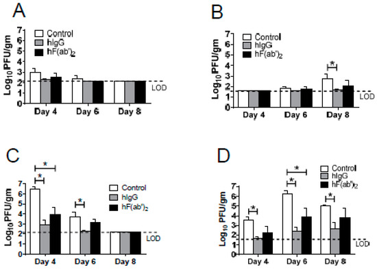 Immune purified IgG and F(ab′)2 transfer reduced the WNV load in the mice. Eight to twelve-week-old WT (A,B) and Mavs−/− mice; (C,D) were infected with 100 PFU WNV in the footpad (s.c.), and 500 μg of the purified horse immune IgG (hIgG) or the purified horse immune F(ab′)2 (hF(ab′)2) was transferred (i.p.) one day before and one day after infection. To obtain the virus titers, the spleens (A,C) and brains (B,D) were homogenized at the indicated time points and titered using Vero cells. The titers are expressed as PFU/g tissue. n = 3–4 mice/group/time point. * p < 0.05. The mice that received normal horse IgG were used as the controls.