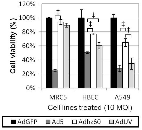 As AdUV contains the wildtype E1 region and thus may be less cancer selective, we therefore compared the lytic effects of AdUV upon cancer and non-cancerous cells. MRC5 non-cancerous lung fibroblasts, HBEC non-cancerous lung epithelial cells, and A549 lung cancer cells were each treated with AdUV, the non-selective Ad5, and the cancer selective E1b-deleted Adhz60 at an MOI of 10. Cell viabilities were determined via crystal violet staining after 72 h. Ad5 was shown to lyse MRC5 and HBEC non-cancerous lung cell lines more effectively than Adhz60 (p-value < 0.001) and AdUV (p-value < 0.001; Figure 2). While AdUV was shown to lyse significantly fewer HBEC cells than Ad5, AdUV may lyse normal lung tissue in vivo. We consider this to be unlikely as Ad5-based oncolytic Ads have not been shown to induce pulmonary toxicity clinically. AdUV, like Ad5, lysed A549 lung cancer cells more effectively than Adhz60 (p-value < 0.01; Figure 2). Therefore, AdUV kills lung cancer cells efficiently, indicating that these AdUV mutations may have enhanced its cancer cell lytic potential.