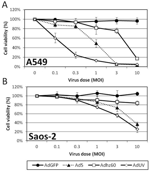 The effect of AdUV upon A549 and Saos-2 cancer cell viability was determined by crystal violet staining following treatment with the indicated Ads for 5 days. A549 cells are known to support greater Ad replication relative to Saos-2 cells [20]. A549 cells displayed the greatest differences in cell viability at an MOI of 1; these viabilities were 91%, 40%, 67%, and 10% for AdGFP, Ad5, Adhz60, and AdUV, respectively (Figure 3A). Saos-2 cells displayed the greatest differences in cell viability at an MOI of 3, and the viabilities were 100%, 74%, 87%, 57% for AdGFP, Ad5, Adhz60, and AdUV, respectively (Figure 3B). These data indicate the enhanced cancer lysis of AdUV compared with the parental strain Ad5.
