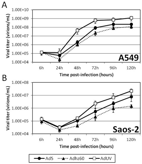 To determine the release kinetics of AdUV, A549 and Saos-2 cells were seeded onto 12-well plates at a density of 1 × 105 and 1.5 × 105 cells per well, respectively. A549 cells were then infected with Ad5, Adhz60 or AdUV at a multiplicity of infection (MOI) of 1. The cells and cell culture samples were then collected at 6, 24, 36, 48, 72, 96 and 120 h post-infection. The cells were separated from the cell culture media and discarded from each sample following centrifugation at 2000 RPM (350 RCF) at 4 °C for 5 min using a micromax RF refrigerated microcentrifuge equipped with an IEC 851 rotor (Thermo Fisher Scientific, Waltham, MA, USA). Cell free media samples were titered to detect the concentrations of Ads released.