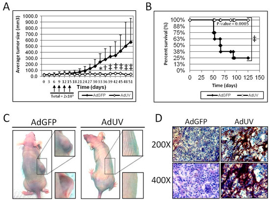 The efficacy and safety of AdUV was further tested in vivo using an A549 subcutaneous athymic nude mouse (NCr-nu/nu) xenograft model. Once tumors grew to 30 mm3, mice were randomized and treated via intratumoral injection with 5 × 108 plaque forming units (PFU) of AdUV or the negative control AdGFP every three days for a total of four treatments (Figure 5A). The length and width of each tumor were measured using a caliper every three days. Mice treated with AdUV exhibited significant suppression of tumor growth with 94% reduction in mean tumor volume compared with mice treated with the control AdGFP vector at day 51 (p-value < 0.001, Figure 5A). Furthermore, all AdUV treated mice (n = 7) survived until day 125 (p-value = 0.0005) while only two AdGFP treated mice (n = 8) survived to that time point (Figure 5B). Representative photographs were taken of mice treated with AdGFP or AdUV at day 51 to display the marked qualitative differences between the two treatment groups (Figure 5C). Furthermore, weight loss or lethargy was not observed following AdUV treatment. In addition, AdUV was shown to express the viral late protein, hexon, in A549 xenograft tumor sections seven days after the final viral injection, which was not detected in tumors treated with AdGFP (Figure 5D). These results indicate that AdUV can be safely used in animals to suppress tumor growth.