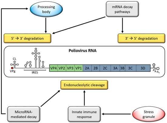 Picornaviruses encounter multiple cellular processes that destabilize vRNA (Figure 1). Given their cytoplasmic replication cycle, picornaviruses avoid nuclear RNA surveillance mechanisms but instead are susceptible to mRNA decay pathways that function in the cytoplasm, such as adenylate uridylate-rich element (ARE)-mediated mRNA decay (AMD). Generally, mRNA decay is initiated by deadenylation of the targeted transcript, followed by 5′→3′ or 3′→5′ degradation of the body of the mRNA by exonucleases. To ensure that vRNAs are not targeted by mRNA decay machinery, picornaviruses disrupt these processes at multiple levels. The strategies that picornaviruses employ to disrupt this antiviral response have been researched more extensively than picornavirus involvement in mRNA decay pathways. This review highlights research focused on picornavirus interactions with pathways or processes associated with RNA decay, largely focusing on EVs, for which the most experimental evidence exists.