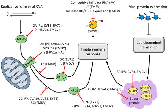 - Feng, Q.; Langereis, M.A.; van Kuppeveld, F.J.M. Induction and suppression of innate antiviral responses by picornaviruses. Cytokine Growth Factor Rev. 2014, 25, 577–585. [Google Scholar] [CrossRef] [PubMed]