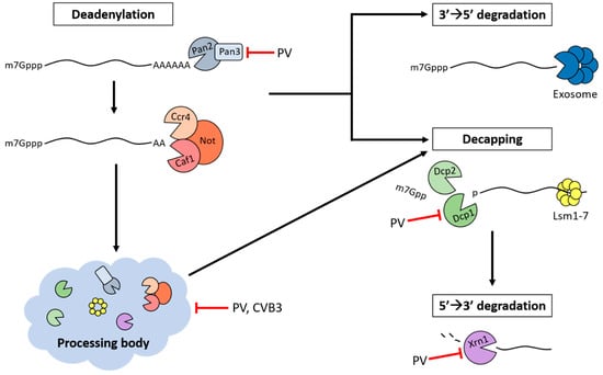 Deadenylation of mRNA is a necessary first step for PB formation. Inhibition of active deadenylation through the expression of dominant negative Caf1 results in almost complete disruption of PBs. Additionally, components of the deadenylase complexes Pan2–Pan3 and Ccr4–Caf1 localize to PBs, and siRNA-mediated knockdown of either Caf1, Ccr4, or Pan3 disrupt PB formation [,]. Therefore, inhibition of deadenylation presents an additional opportunity for virus-mediated disruption of PBs. Upon examination of deadenylase components following poliovirus infection, it was discovered that Pan3 is degraded, possibly as result of 3C cleavage, while PARN, Pan2, Ccr4, and Caf1 remain intact []. Knockdown of Pan3 has been shown to block PB formation but does not impair deadenylation of mRNAs []. Thus, poliovirus-mediated degradation of Pan3 may contribute to the disruption of PBs by preventing the association or nucleation of PB components, not through blocking deadenylation.