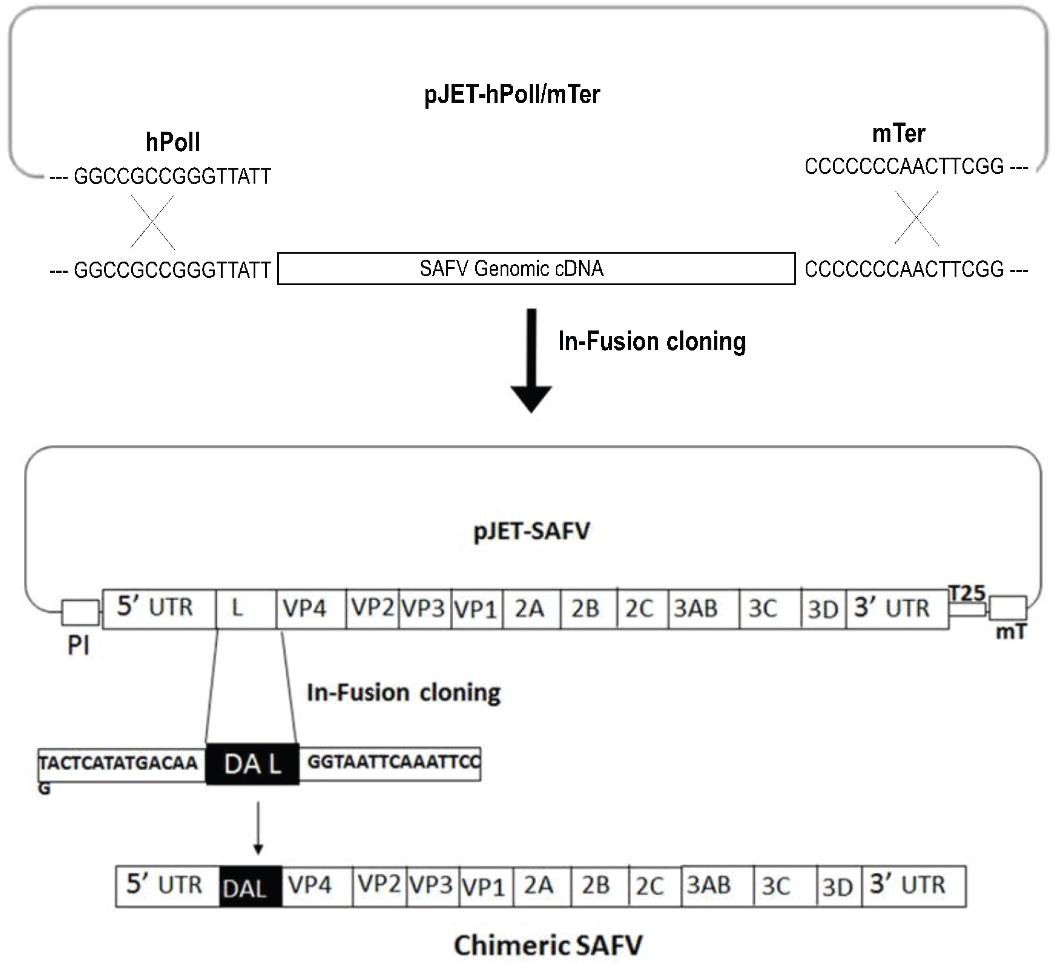 Strategy for the construction of SAFV and chimeric SAFV constructs. The pJET-SAFV plasmid was generated by insertion of SAFV cDNA amplicon into pJET-hPolI/mTer. Further, DA L gene from TMEV was flanked with linear pJET-SAFV between 5'UTR and VP4 using an In-Fusion cloning method. After transfection of pJET-DAL-SAFV into Vero cells, chimeric SAFV virus was rescued. PI: human polymerase I promoter; 25: poly (A) tail with 25 As; mT: murine terminator.