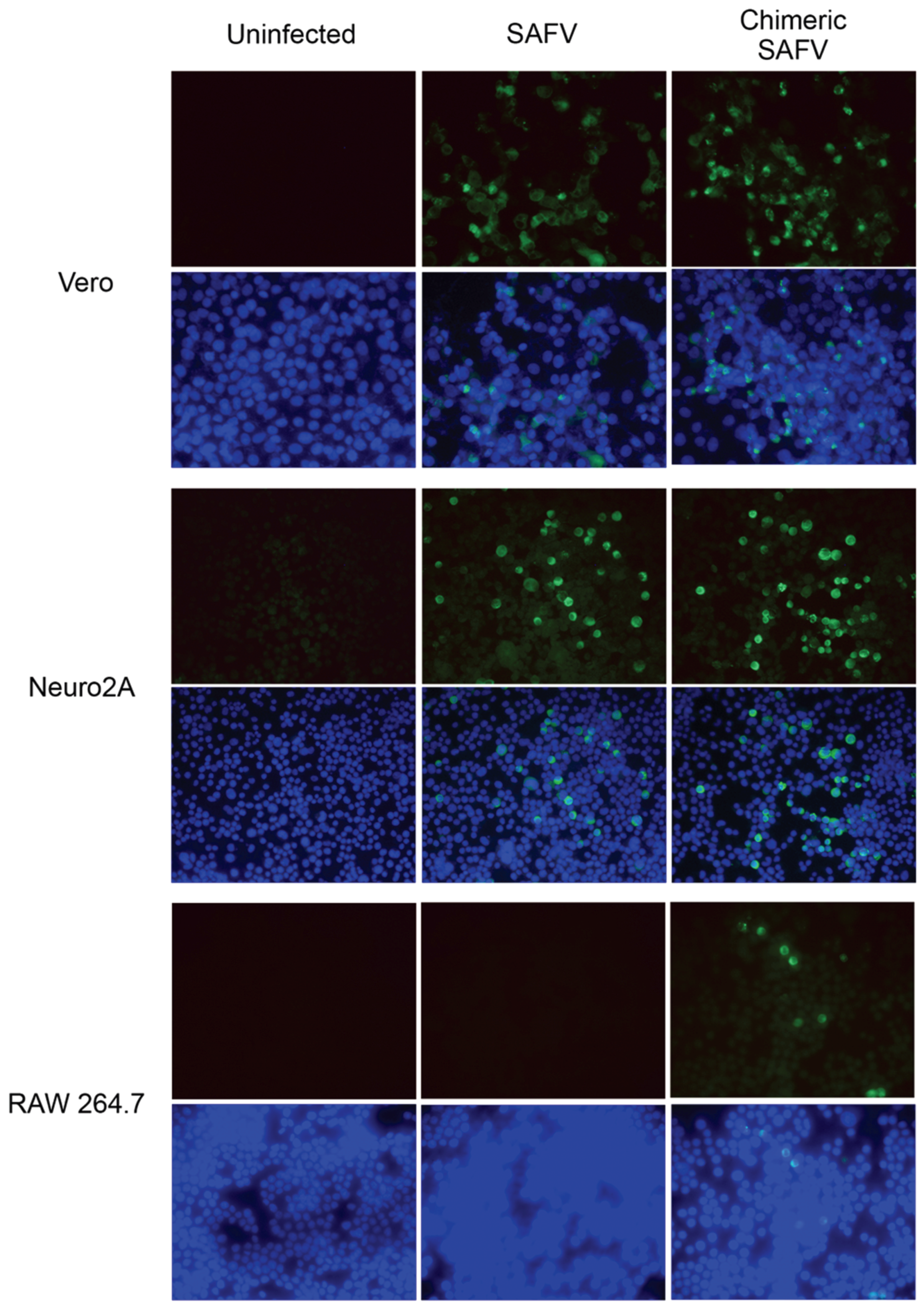 Immunofluorescence assay for detection of virus-infected cells demonstrated that SAFV or chimeric SAFV infected both Vero and Neuro2a cells. In contrast, no fluorescent signals were seen for SAFV infected RAW 264.7 cells and very few fluorescent-positive cells were seen for chimeric SAFV infected RAW 264.7 cells (Figure 2).