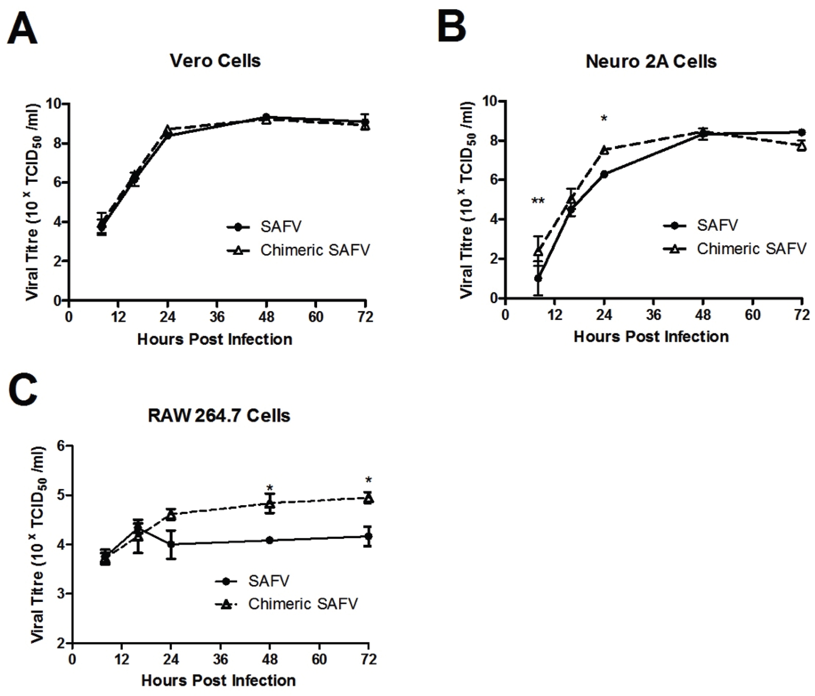 Growth Kinetics of SAFV or chimeric SAFV in Vero (A); Neuro2a (B) or RAW 264.7 (C) cells. Data presented in mean ± SEM. There was an effect in time in all cells, an effect of virus in Neuro2A and RAW 264.7, but not Vero cells, and an effect of interaction only in RAW 264.7, but not Vero or Neuro2A cells. Bonferroni post hoc analysis of Vero cells revealed no significance at any time point. Bonferroni post hoc analysis of Neuro2A cells revealed significannce difference at eight and 16 h time point. Bonferroni post hoc analysis of RAW 264.7 cells revealed difference at 48 and 72 h time point. ** represents p < 0.01, * represents p < 0.05.