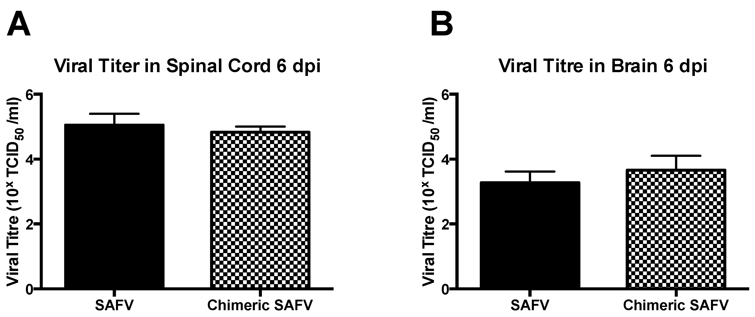 Virus titers in CNS 6 dpi. Data presented in mean + SEM. Two-week-old AG129 was infected with either SAFV or Chimeric SAFV, spine and brain were obtained 6 dpi, and viral titer was determined by TCID50 using Reed and Muench method, Unpaired t-test revealed no significant difference seen between viral titers of SAFV and Chimeric SAFV in both spine (A) and brain (B).