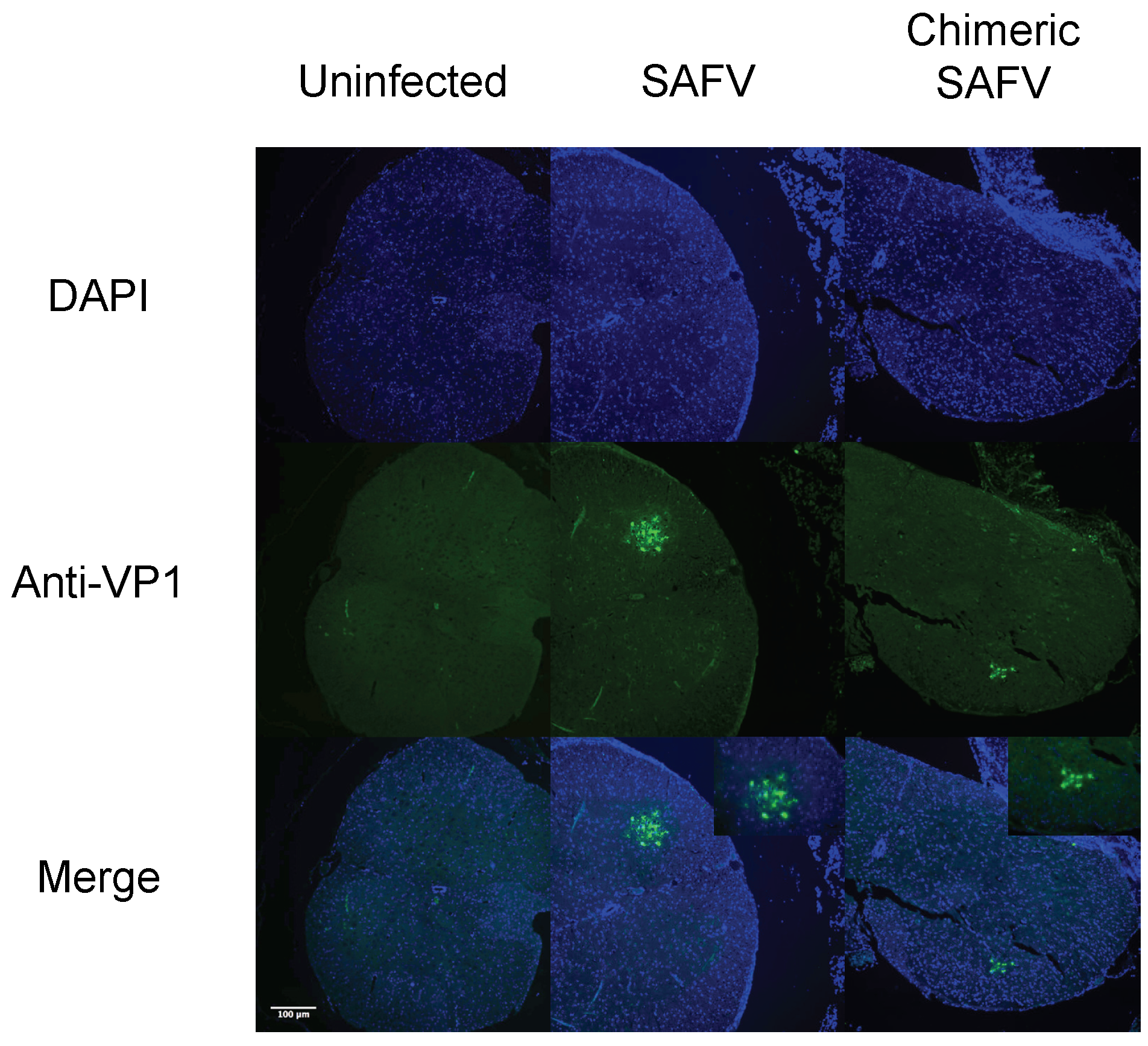 Fluorescence images of uninfected, SAFV infected, and chimeric SAFV infected spine sections. Two-week-old AG129 was infected with either SAFV or Chimeric SAFV, and spine was obtained 6 dpi. Spine sections were stained with anti-VP1 antibodies (Green) and counterstained with DAPI (Blue). SAFV and chimeric SAFV infected sections show staining at the ventral horn.