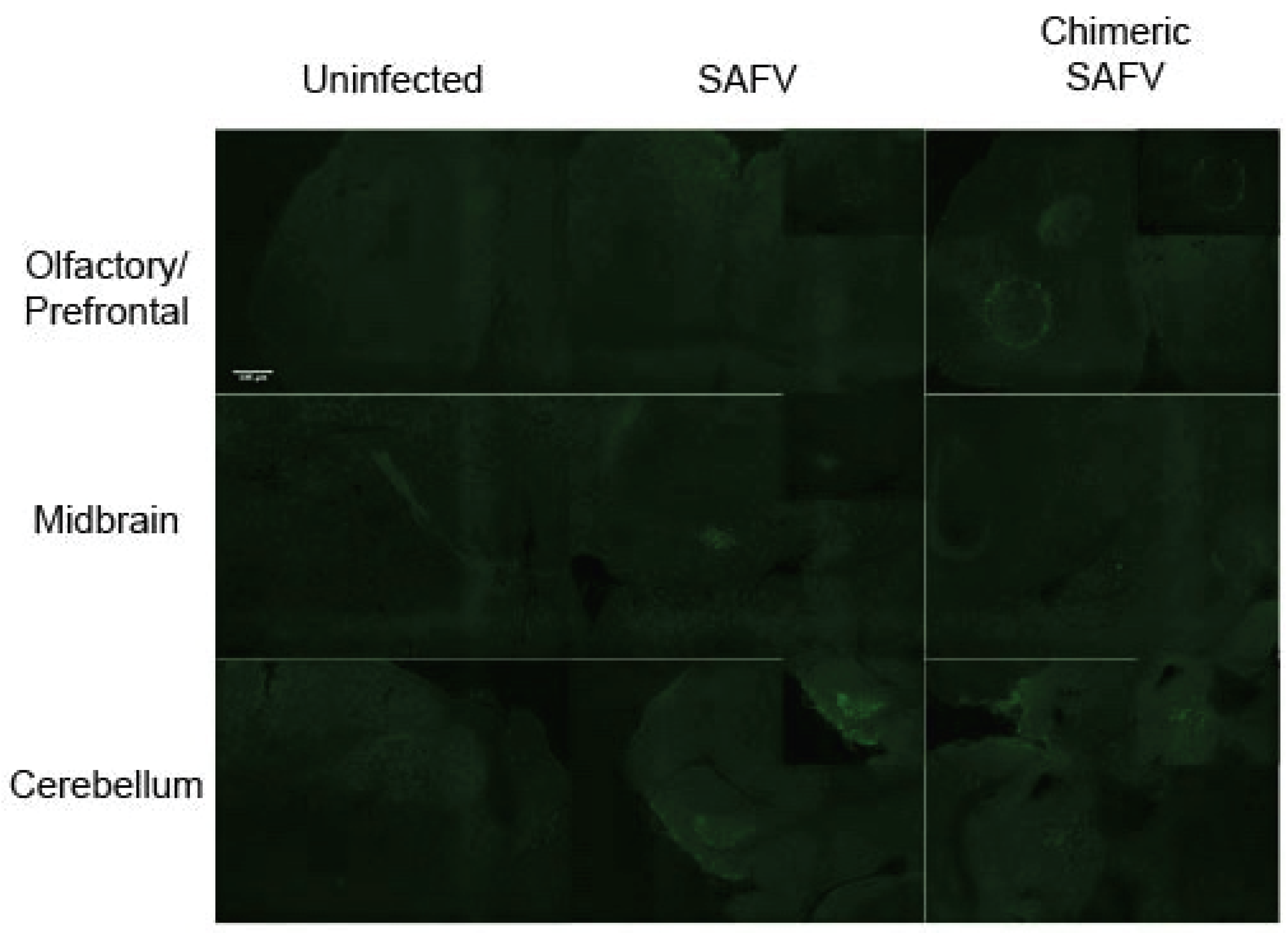 Fluorescence images of uninfected, SAFV infected, and chimeric SAFV infected brain sections. Two-week-old AG129 was infected with either SAFV or Chimeric SAFV, and brain was obtained 6 dpi. Sections were stained with anti-VP1 antibodies (Green). SAFV infected brains show staining in the olfactory/prefrontal area, midbrain, and cerebellum. Chimeric SAFV infected brains show staining in the olfactory/prefrontal area, and cerebellum, but not in the midbrain.